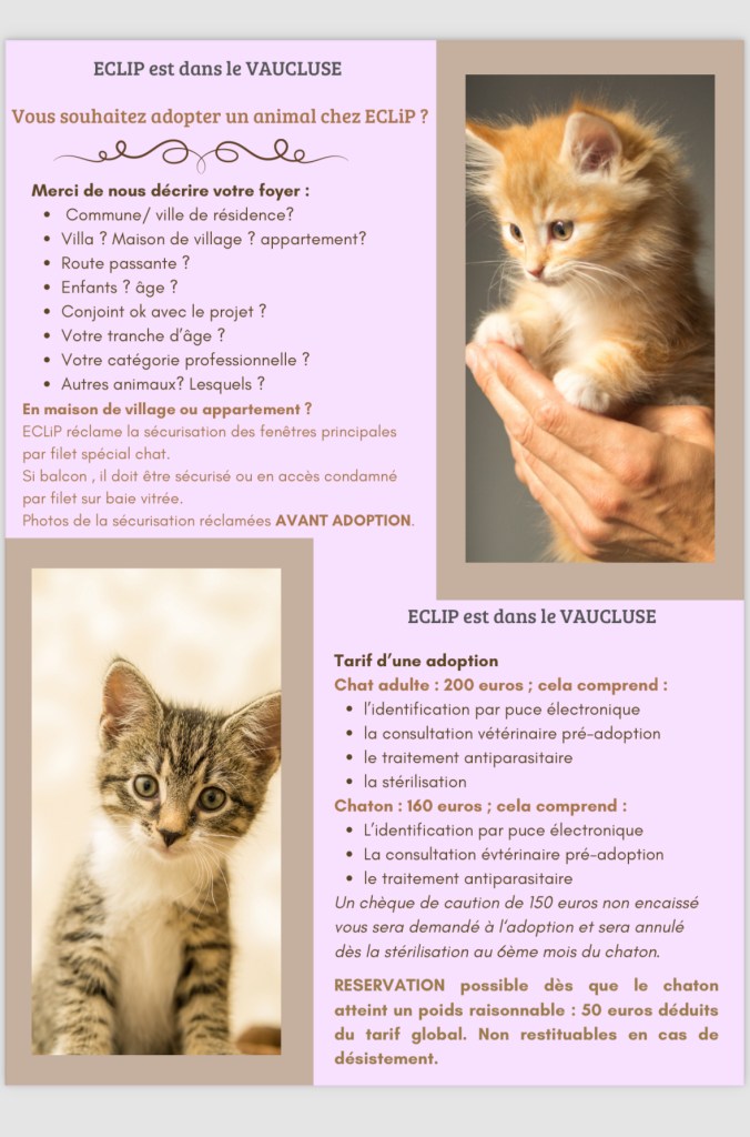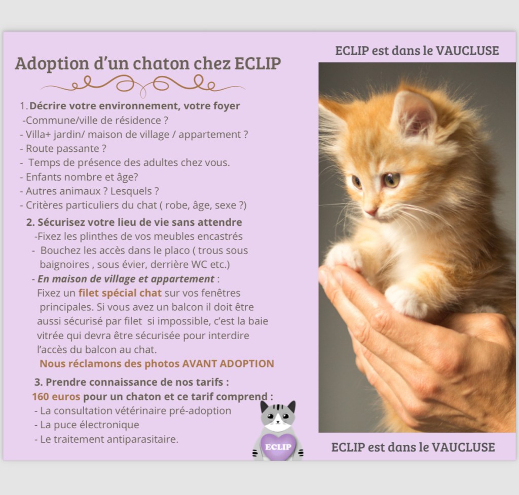 - Donner des nouvelles à l’association sur l’adaptation du chaton dans les. premières semaines de son arrivée chez vous.